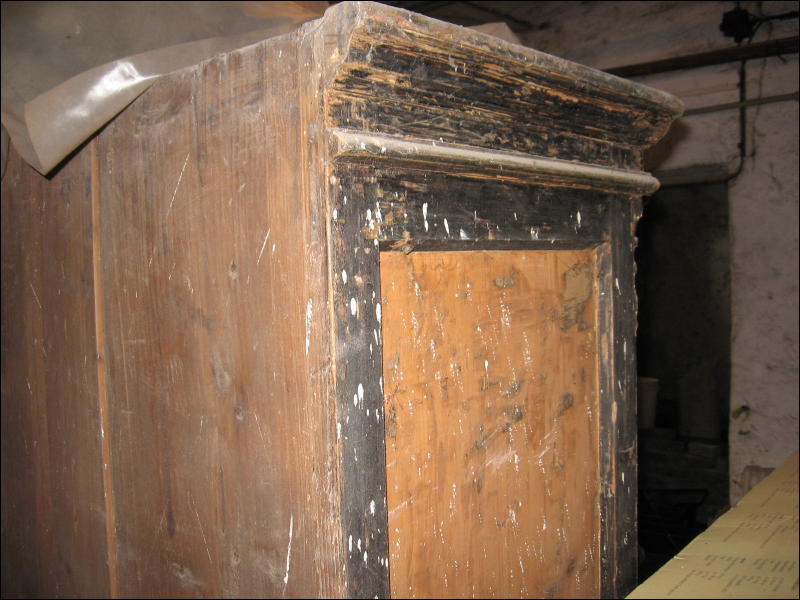 Celý korpus velmi napaden červotočem, místy až na perník, povrch několikrát přetíraný různými druhy barev, přední kanelované sloupky a horní kameny nepůvodně natřené pojivem s bronzem